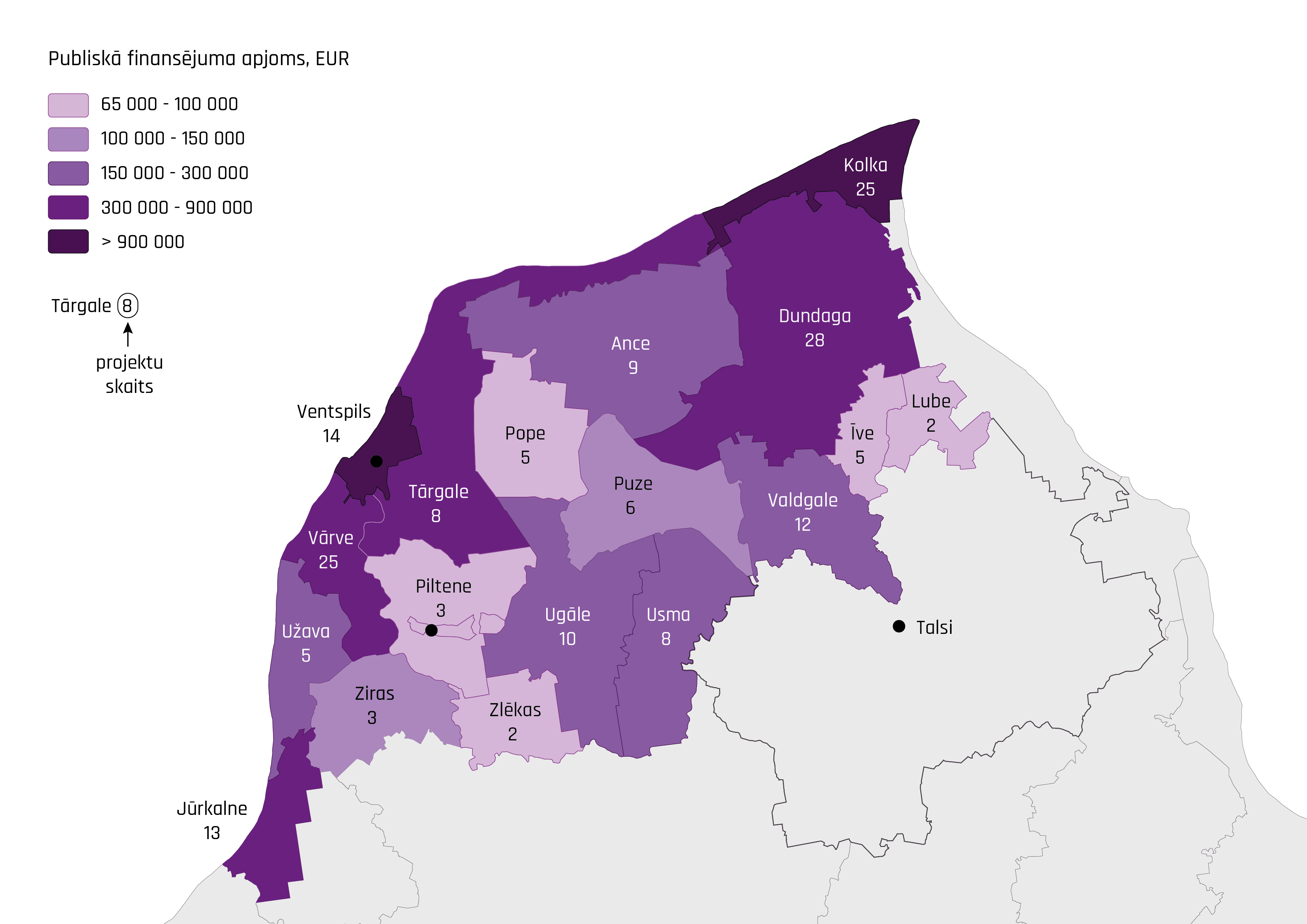 Atbalstu biedrības teritorijā guvuši vairāki veiksmīgi publiskās infrastruktūras projekti: dabu un vidi saudzējoša tūrisma veicināšana Kolkas piekrastē – izveidots stāvlaukums Kolkā, pašvaldības autoceļu posmu pārbūve labākai piekļuvei jūrai Mazirbē, Užavā un Jūrkalnē. Izveidota dabu un vidi saudzējoša Staldzenes stāvkrasta pieejamība un pilnveidota atpūtas zonas infrastruktūra; veikts Ventas krasta labiekārtojums Vārves ciemā.