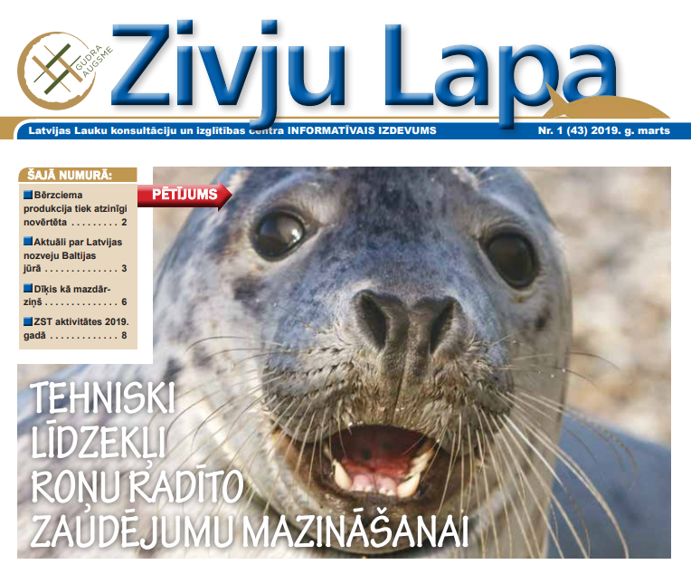 Šajā informatīvā izdevuma numurā plašs materiāls par tehnisko līdzekļu piedāvājumu roņu radīto zaudējumu mazināšanai zvejniekiem un Latvijas pētnieku ieguldījumu šīs problēmas risināšanā.