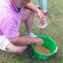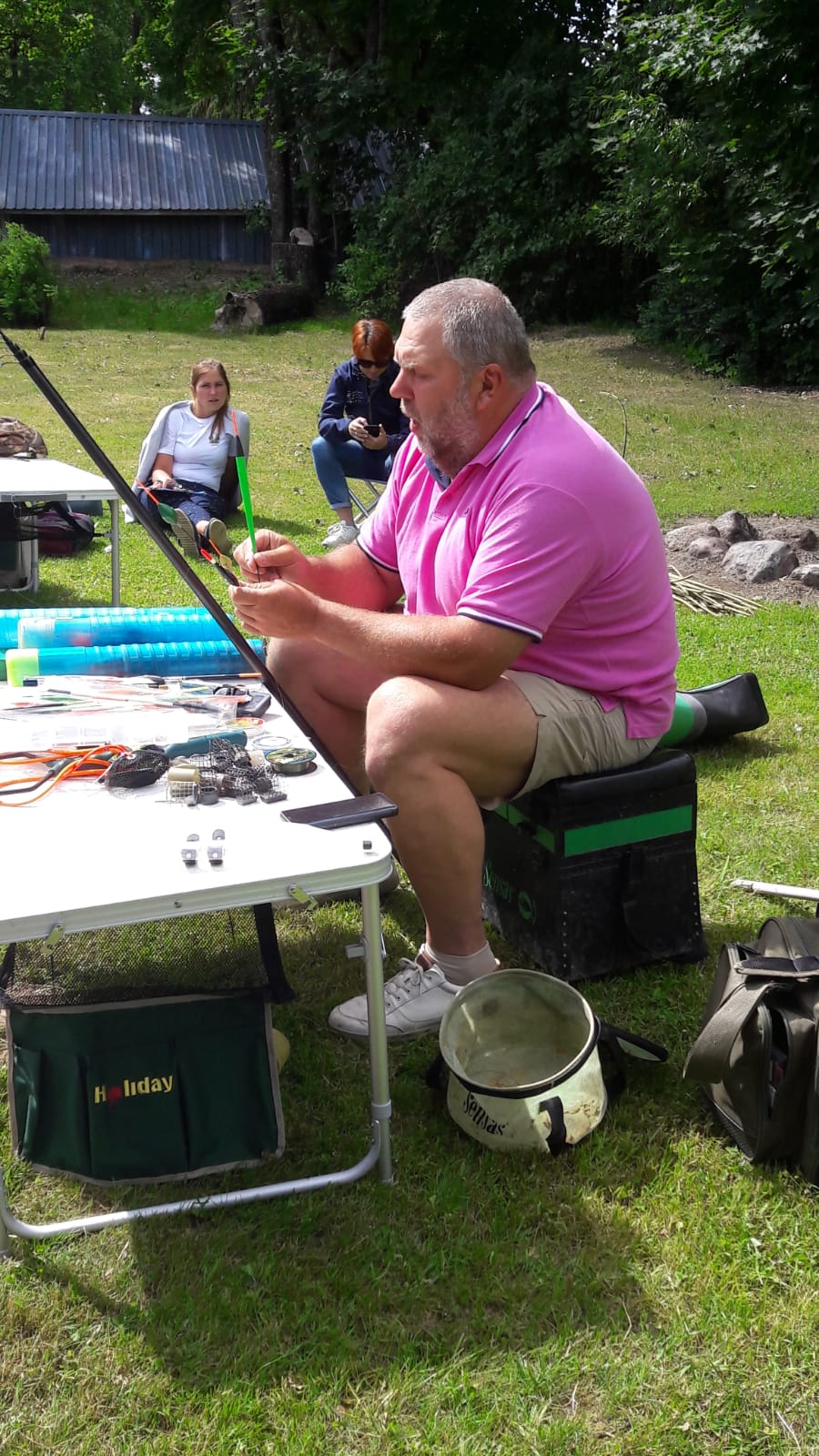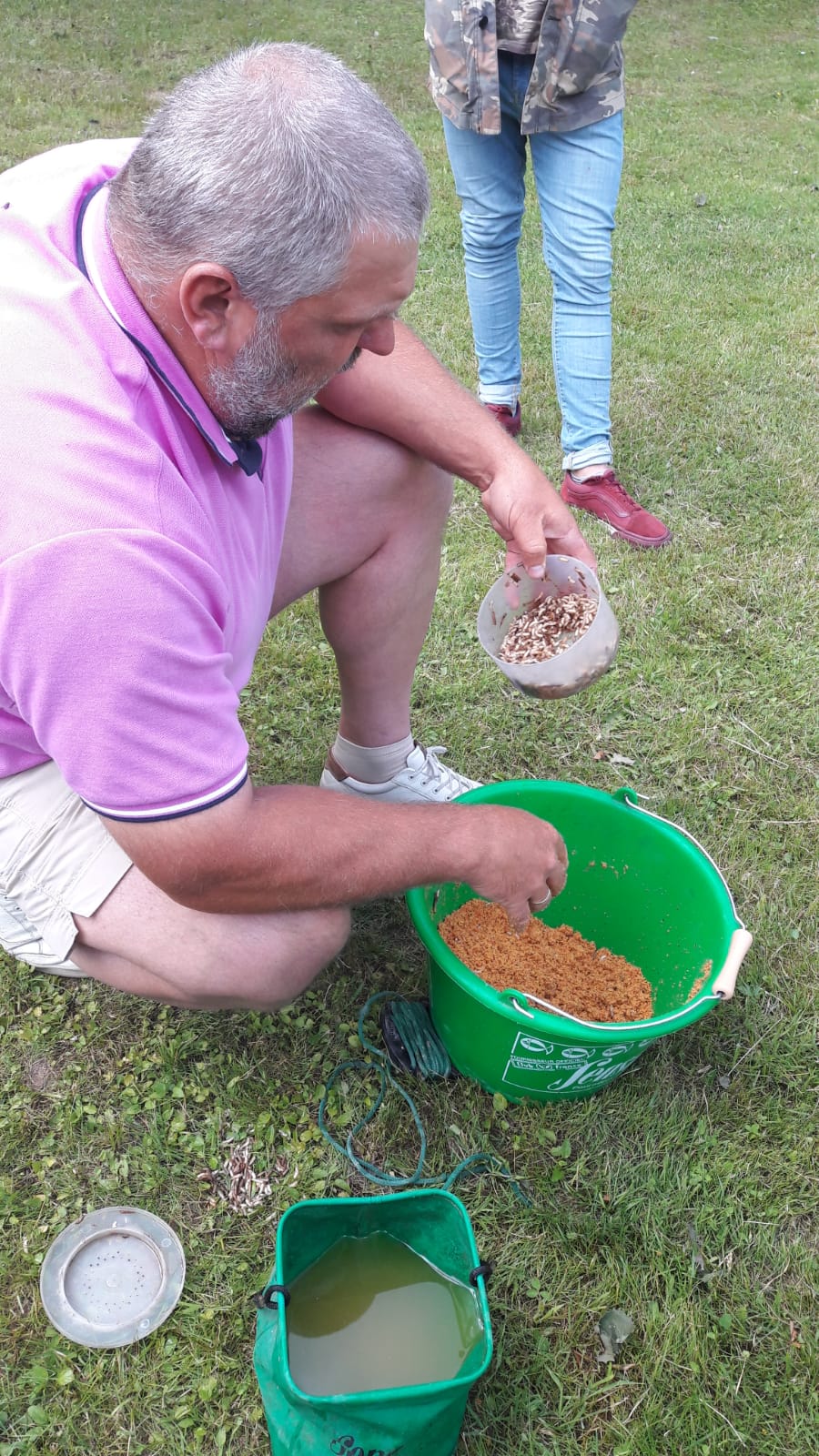 Lai zivis pieķertos, nepieciešams tās arī pabarot. Normunds praktiski parādīja, kā veikalā iegādātā barība tiek sagatavota, samitrināta un pasniegta. Svarīgi atcerēties, ka katrai zivju sugai ir jāzina, cik mitru, cik daudz un kādu barību sagatavot, lai tās vēl varētu arī noķert.