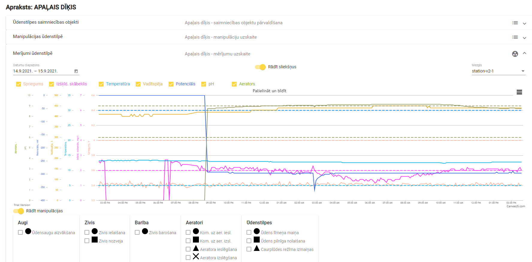 – Sistēmas testēšana norisinājās no 2021. gada sākuma līdz oktobrim dīķsaimniecībā “Pērtnieki”, kurā tika izvietoti 6 mobilie sensoru mezgli, kas ļauj reālā laikā sekot līdzi ūdens temperatūrai, izšķīdušā skābekļa, pH, oksidēšanas-reducēšanas potenciāla līmeņiem un citiem parametriem. Tika uzstādīti arī divi aeratori ar atbilstošiem attālinātās vadības moduļiem, kas ļauj veikt iekārtu automātisku ieslēgšanu/izslēgšanu ūdenī, izšķīdušā skābekļa līmenim izejot ārpus pieļaujamām robežām.