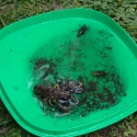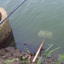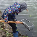 Bērni tika iepazīstināti arī ar tādu oficiālā vārdā nenosauktu ierīci, kuru varētu dēvēt par smeļamo kausu. Tas paredzēts, lai saprastu, kas dzīvo uz grunts ūdenstilpes apakšā. Ar to izsmeļ biezumus no upes dibena, liekais ūdens notek, un var redzēt, kādas dzīvās būtnes un kukaiņi dzīvo ūdenstilpē un ar ko zivis barojas. Ar pirmo reizi izdevās izvilkt vēzi – lielākā daļa bērnu nebija dzīvu vēzi redzējuši. Izraisījās diskusijas par to, vai vēzis tēlo beigtu vai nē. Lektors precizēja – esot sabijies, bet dzīvs. Tas esot kāds no signālvēžu veidiem, kas izēd citu zivju oliņas. Vēžiem nepatīk netīrs ūdens. Tas nozīmē, ka mūsu izvēlētajā ūdenstilpē ūdens ir tīrs. Vairākās reizēs izdevās samelt trīs vēžus dažādos izmēros, arī pavasarī dzimušu mazu vēzīti. Sasmeltajos biezumos atradām arī mazas spārītes, kuras pirms brīnumainajām pārvērtībām izskatās kā vabolītes vai melni sienāži. Tādus spāru kukaiņus taisa arī no gumijas. Tārpi ir kā delikatese un torte zivīm, no kā tās nespēj atteikties.
