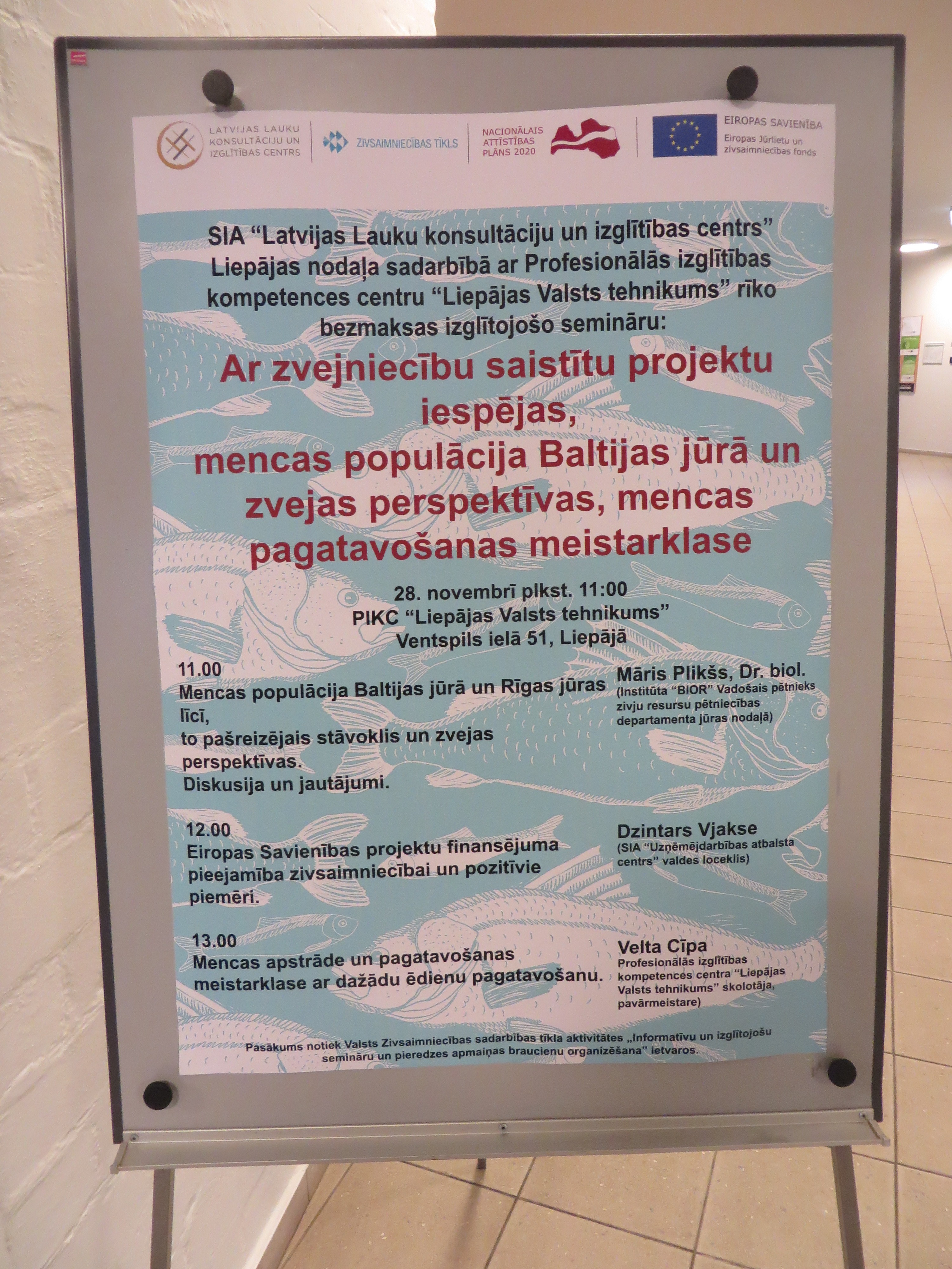 Latvijas Lauku konsultāciju un izglītības centra Liepājas nodaļa sadarbībā ar Profesionālās izglītības kompetences centru “Liepājas Valsts tehnikums” novembra beigās rīkoja bezmaksas izglītojošo semināru “Ar zvejniecību saistītu projektu iespējas, mencas populācija Baltijas jūrā un zvejas perspektīvas, mencas pagatavošanas meistarklase”.