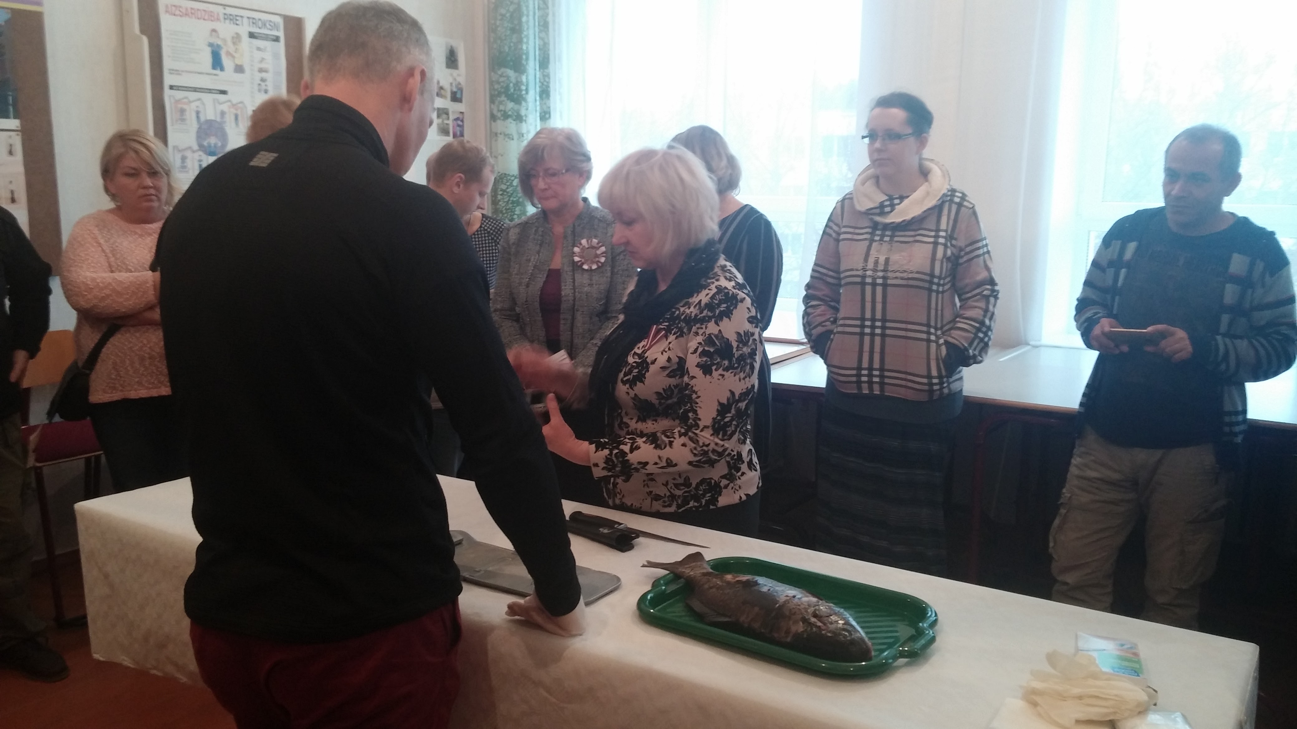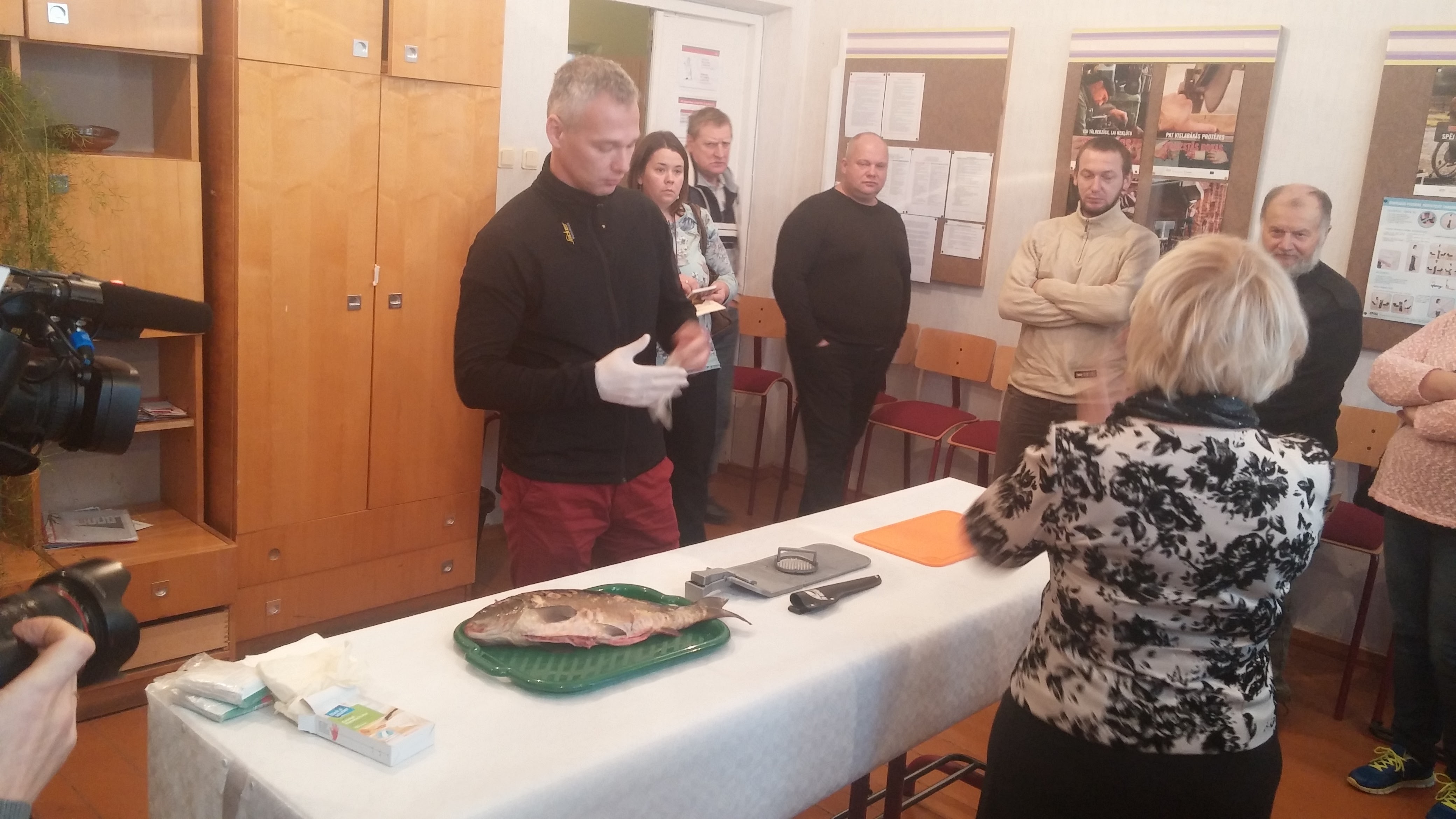 Lai seminārā gūtu arī praktiskas iemaņas, vienam no dalībniekiem bija iespēja veikt karpas filēšanu un ādas novilkšanu. Skolotājas pavadībā šis uzdevums tika veiksmīgi paveikts. Ļoti noderīgi bija uzzināt un apskatīt arī zivju pirmapstrādei paredzētos instrumentus, kas atvieglo darba procesu.