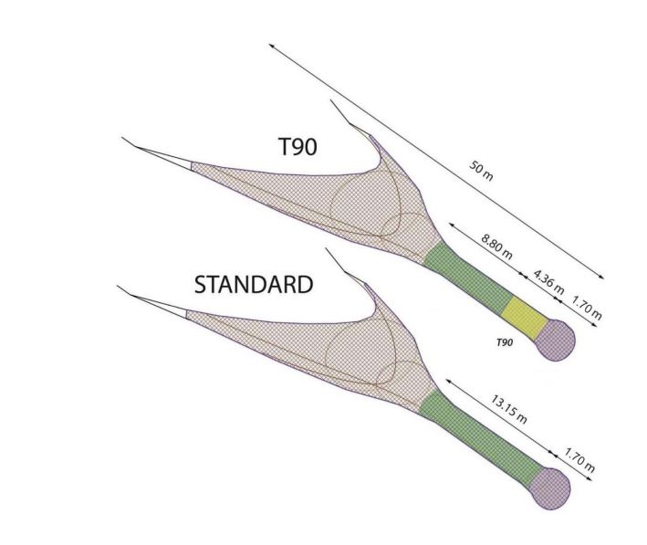 - Tika pierādīts, ka T90 tīkls nozvejo par 15–28 % mazāk mazu garneļu (līdz 18 mm) nekā tradicionālais tīkls.