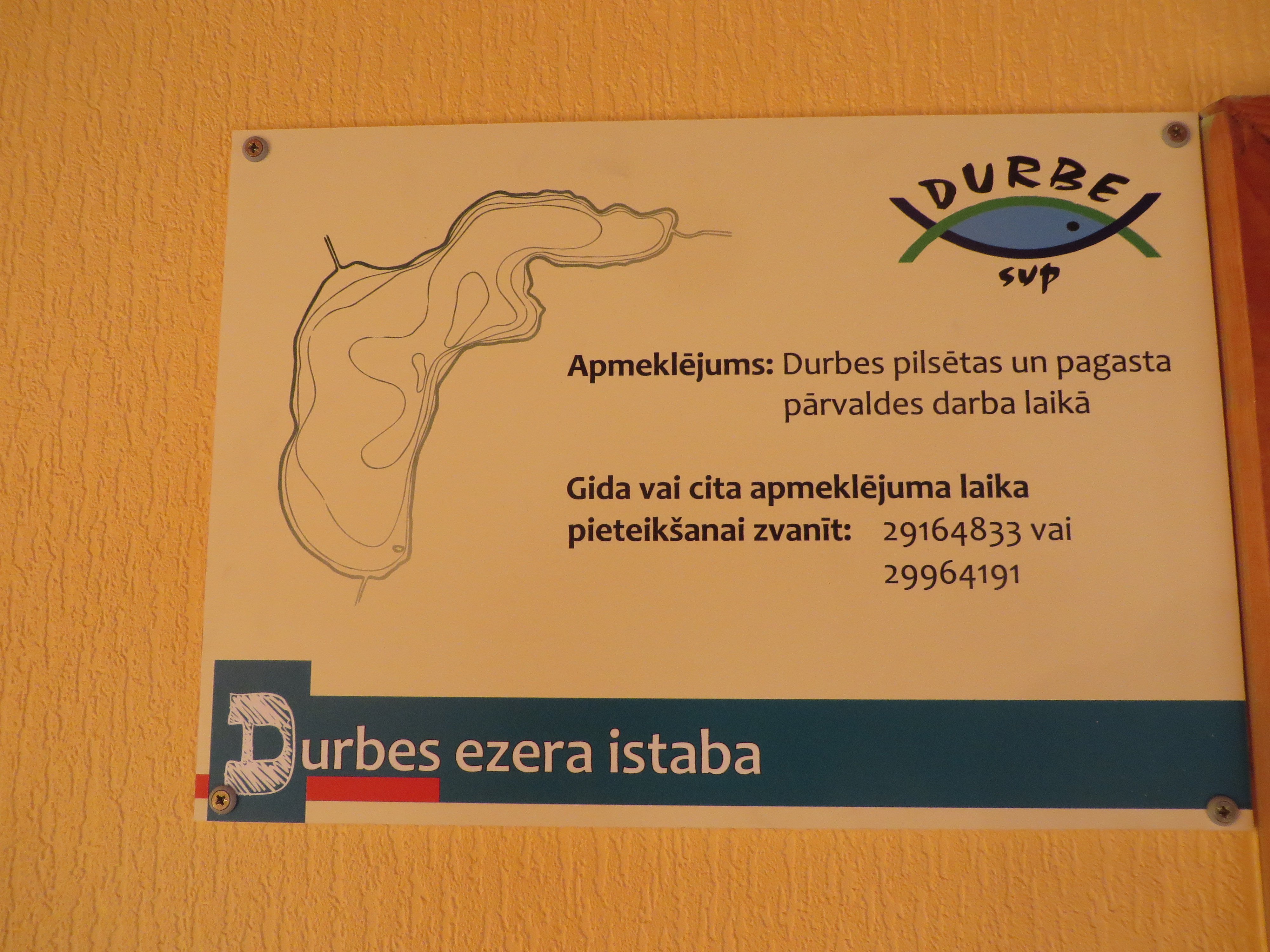 Durbē apmeklējam informatīvi izglītojošo ekspozīciju par Durbes ezeru, kuru 2014. gadā, piesaistot Eiropas Zivsaimniecības fonda līdzekļus, izveidoja biedrība “Sabiedriskās vides pārvalde „Durbe”” kopā ar pašvaldību.