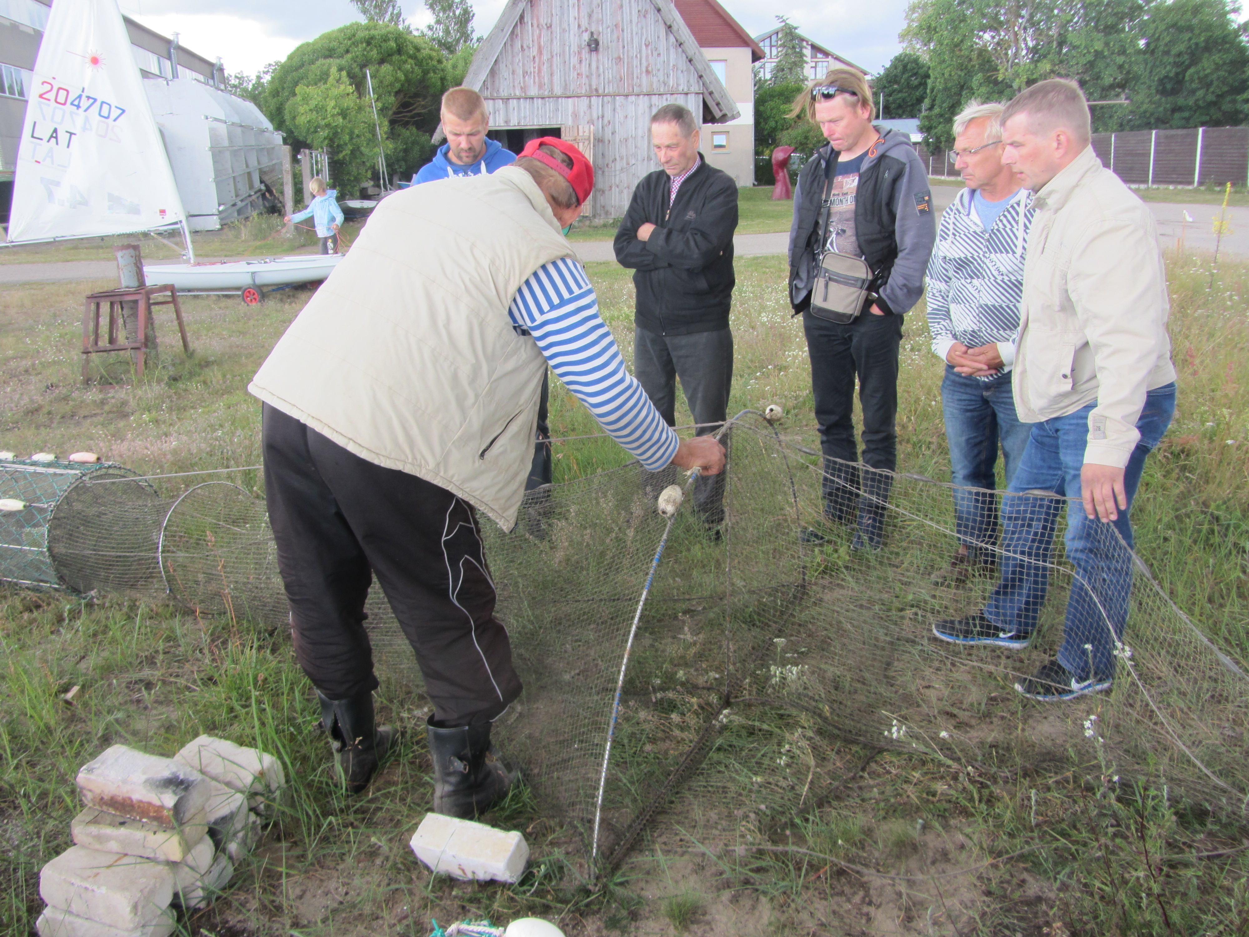 Braucot uz nākamo pieturvietu Engures ostā, autobusā kopīgi spriedām, vai tikai draudīgie negaisa mākoņi nesabojās tikšanos ar Tamsonu Jāni, kurš solījās mums izrādīt, kā efektīvāk sargāt zivju murdu un tajā esošās zivis no roņu postījumiem. Murda konstrukcijas uzlaboto veidu apskate arī tika plānota pie Jāņa, tāpēc turējām īkšķus, lai lietus pagaida, vismaz nedaudz. Iebraucot ostā, pa gabalu varējām manīt Jāņa laivu, uz kuras bija izvietoti jūrā vedamie murdi, saimnieks pats bija blakus un varēja stāstīt interesentiem par saviem izgudrojumiem. Un to Jānis Tamsons prot, ne velti Latvijas televīzijas raidījumā tika nosaukts par murdu meistaru. Salacgrīvieši skatījās, uzdeva jautājumus, bildēja konstrukcijas elementus, lai varētu vērtīgākās lietas ņemt savā bruņojumā. Sarunas ievirzījās arī par lucīšu nozvejas apjomiem, katra puse salīdzināja skaitļus pa gadiem, secināja, ka apjomi svārstās. Ilgi vēl varētu spriest par kopējām lietām, bet lietus mudināja mūs uz jauno pieturvietu.