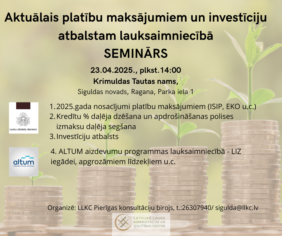 Šos un citus praktiskus jautājumus 2025.gada lauksaimniecības darbību atbalstam aicinām risināt 23.04.2025., plkst.14:00 'Krimuldas Tautas namā', Ragana, Parka iela 1, Krimuldas pagasts, Siguldas novads.