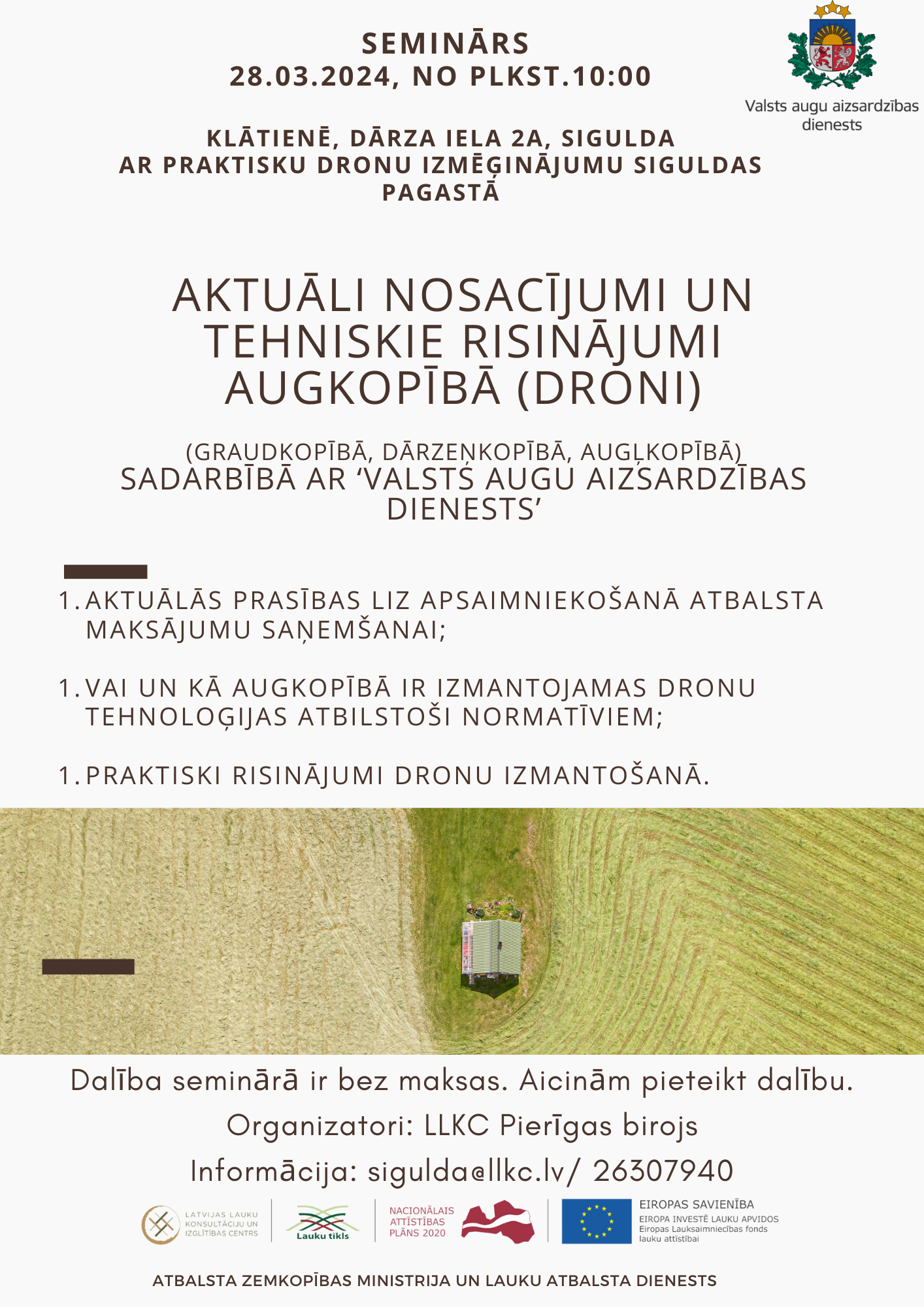 Kāda satura uzskaite augkopības saimniecībām ir jāveic 2024.gadā t.sk. vides jutīgās teritorijās. Kādas tehnoloģijas saimniecība var izmantot datu uzskaitē un platību apsaimniekošanā. Kādus tehniskos risinājumus augkopībā var nodrošināt dronu tehnoloģijas - datu ieguve, resursu izkliede, platību apsaimniekošana u.c.