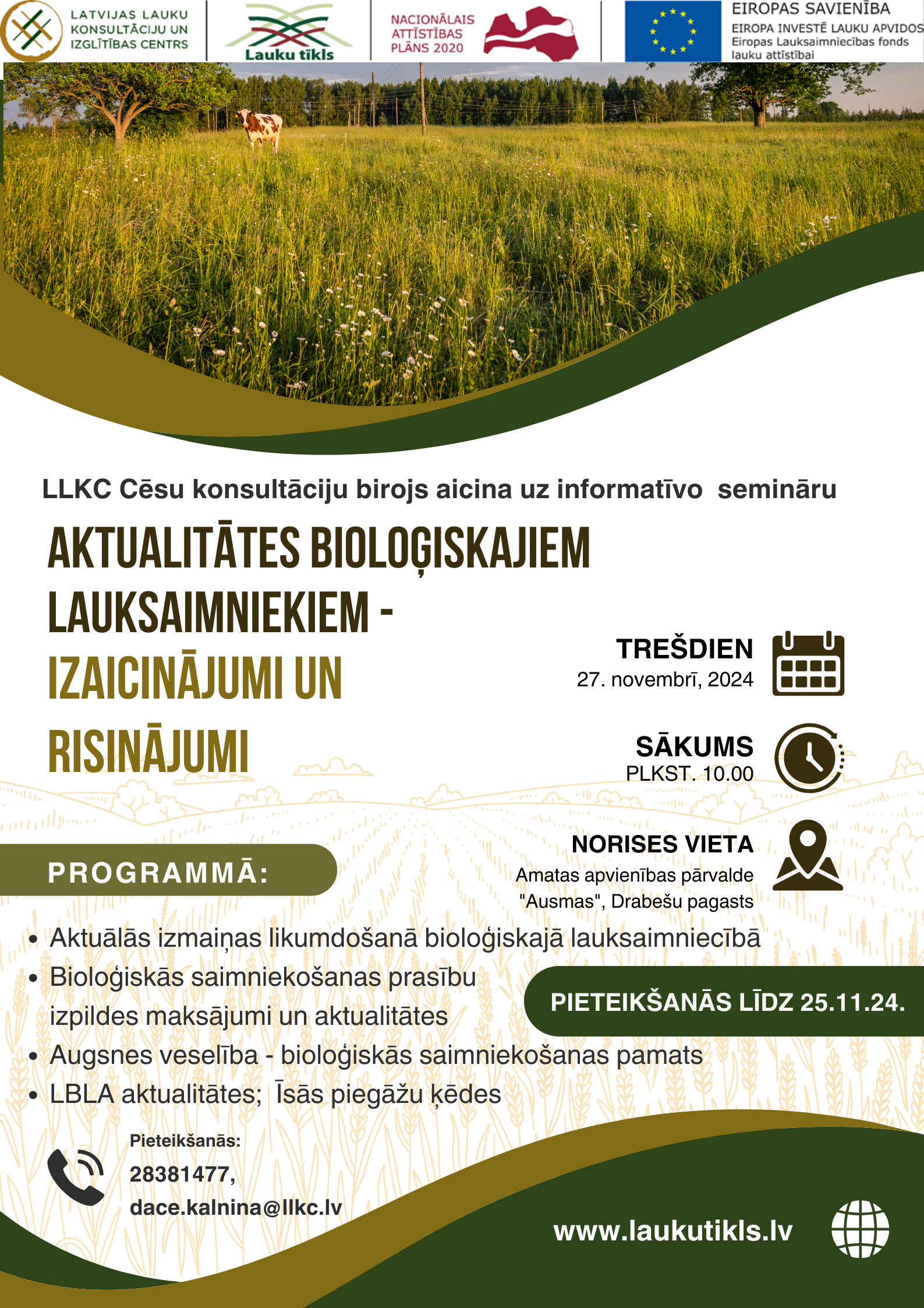 LLKC Cēsu birojs organizē informatīvu semināru bioloģiskajiem lauksaimniekiem par aktualitātēm nozarē. Seminārs notiks 27.novembrī, plkst.10:00, Cēsu novada Drabešu pagasta "Ausmās", zālē.