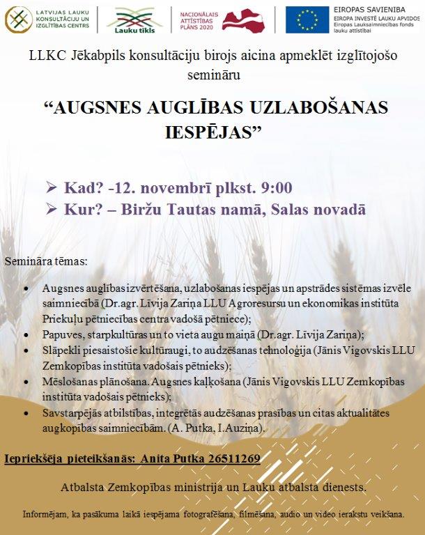12. novembrī plkst. 9:00 Salas novadā Salas pagasta Biržu Tautas namā notiks izglītojošs seminārs "Augsnes auglības uzlabošanas iespējas"