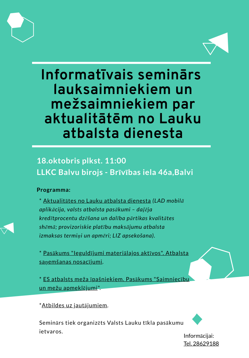 SIA LLKC Balvu konsultāciju birojs aicina Jūs šā gada 18.oktobrī plkst. 11:00 apmeklēt bezmaksas informatīvo semināru “Lauku attīstības programmas aktuālie pasākumi lauksaimniekiem, mežsaimniekiem”.