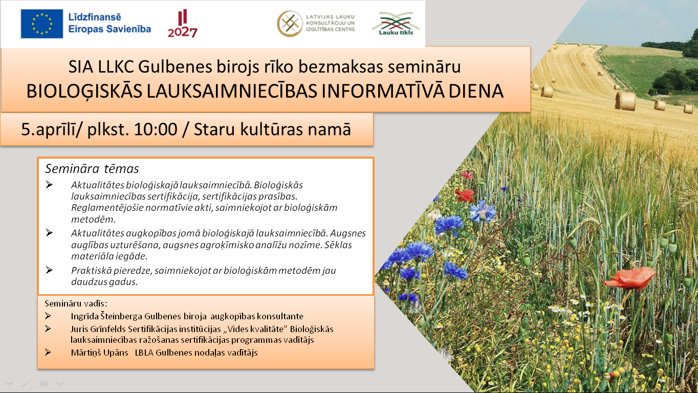 SIA LLKC Gulbenes birojs 5.aprīlī, Staru kultūra namā plkst. 10:00 rīko bezmaksas semināru BIOLOĢISKĀS LAUKSAIMNIECĪBAS INFORMATĪVĀ DIENA.