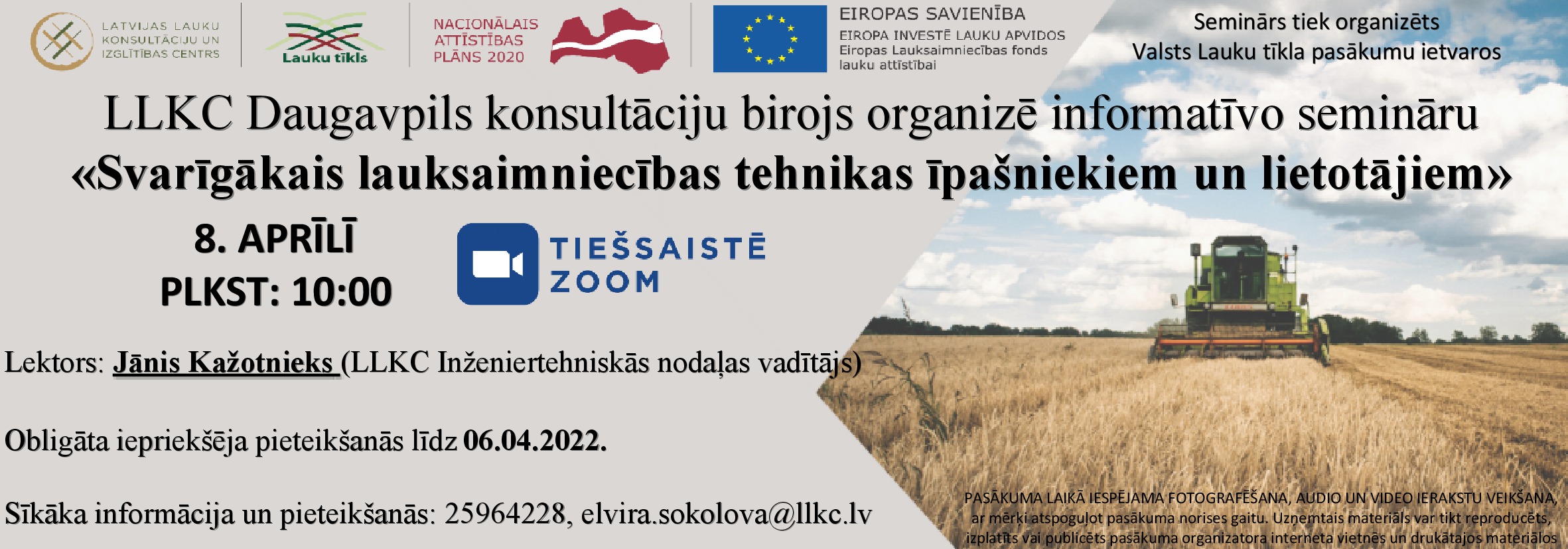LLKC Daugavpils konsultāciju birojs piedāvā bezmaksas tiešsaistes informatīvo semināru Valsts lauku tīkla ietvaros "Svarīgākais lauksaimniecības tehnikas īpašniekiem un lietotājiem".