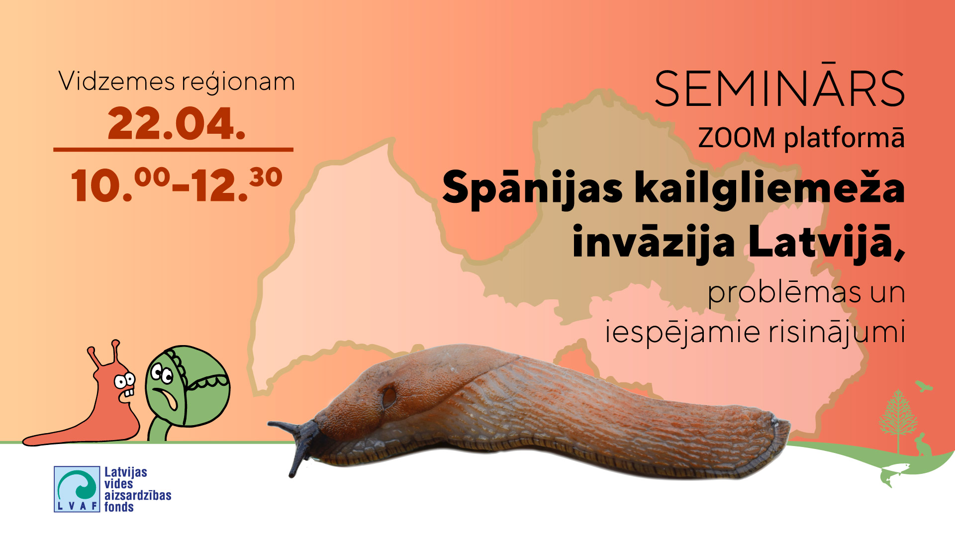 Seminārs tiek organizēts ar Latvijas vides aizsardzības fonda finansiālu atbalstu PROJEKTA „DATU IEGUVE PAR SPĀNIJAS KAILGLIEMEŽA (ARION VULGARIS) JAUNAJĀM ATRADNĒM, SUGAS IZPLATĪŠANAS CEĻIEM, POPULĀCIJU DZĪVOTSPĒJU UN IETEKMI UZ VIETĒJO SARKANĀ KAILGLIEMEŽA (ARION RUFUS) POPULĀCIJU” (NR 1-08/187/2020) ietvaros.