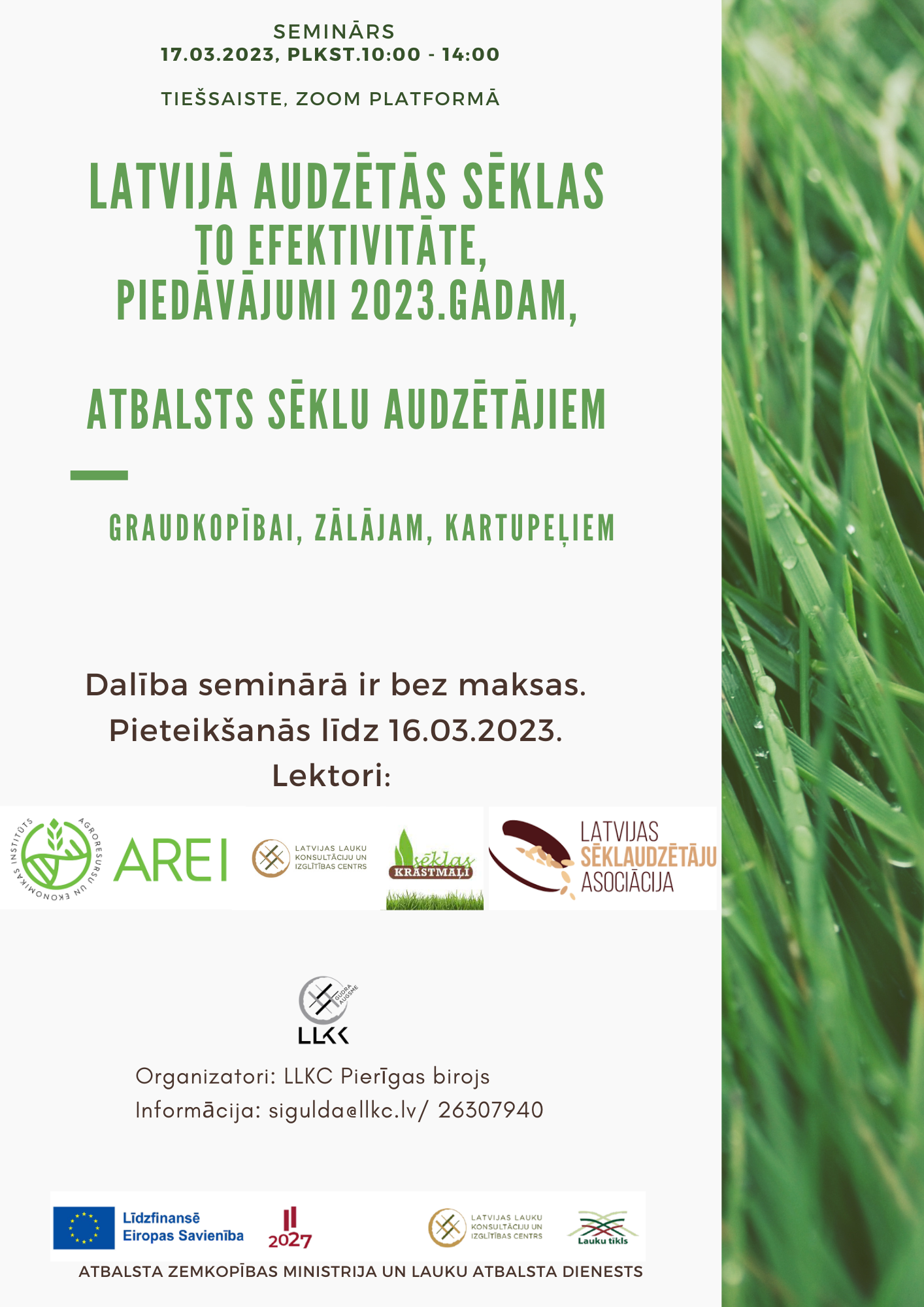 17.03.2023., Praktisks seminārs par Latvijā selekcionētām un audzētām sēklām - graudkopībā, zālājiem, kartupeļiem. Aktuālie piedāvājumi, šķirņu ražība. Kā papildus informācija ir iespējas kļūt par sēklu audzētāju.