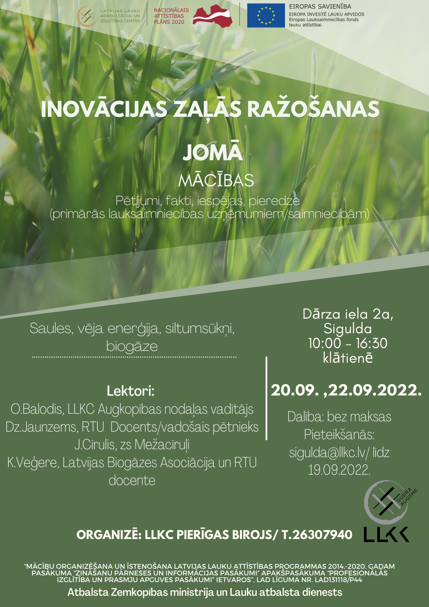 Mācību dalībnieku skaits ir ierobežots. Pieteikšanās: sigulda@llkc.lv iesūtot savu kontaktu informāciju (e-pasts/tālruņa numurs tālākai saziņai) un teksts: 'Vēlos piedalīties mācībās "Inovācijas zaļās ražošanas jomā"