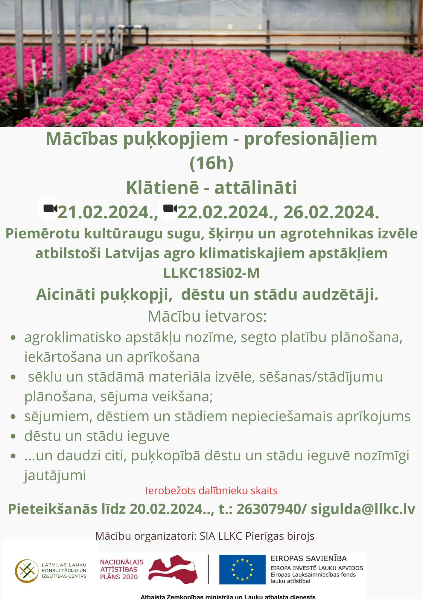 tiešsaistē (zoom platformā) 21.02.2024. un 22.02.2024.. Klātienē praktiskas mācības zs 'Kliģēni' un 'Zaļumnīca' puķkopības dārzkopībās.