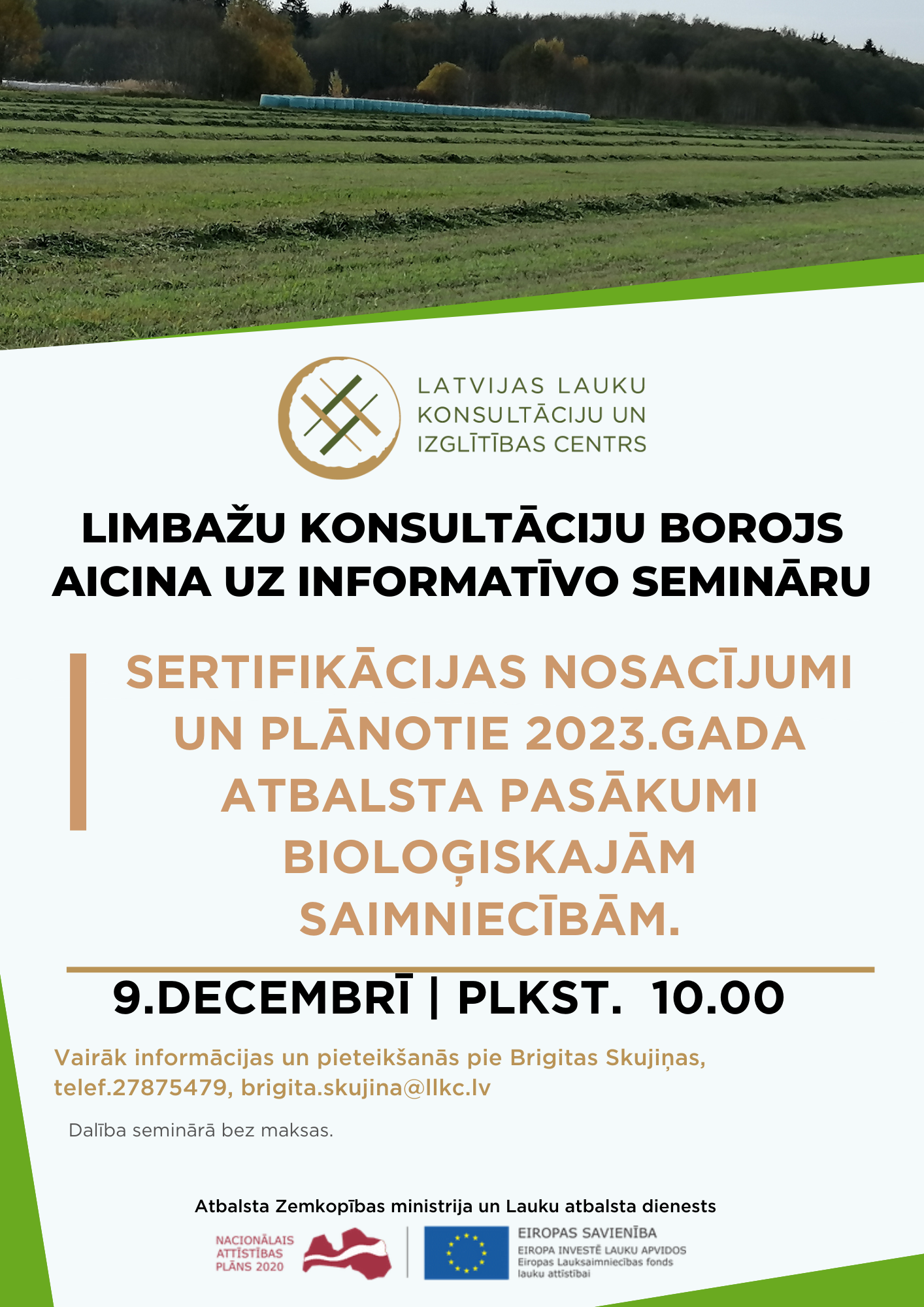 SIA LLKC Limbažu KB rīko semināru par likumdošanas un sertifikācijas prasībām bioloģiskajām saimniecībām un 2023.gada atbalsta pasākumiem bioloģiskajiem lauksaimniekiem, kā arī klausītāji tiks informēti par SIA LLKC Limbažu KB aktualitātēm.
