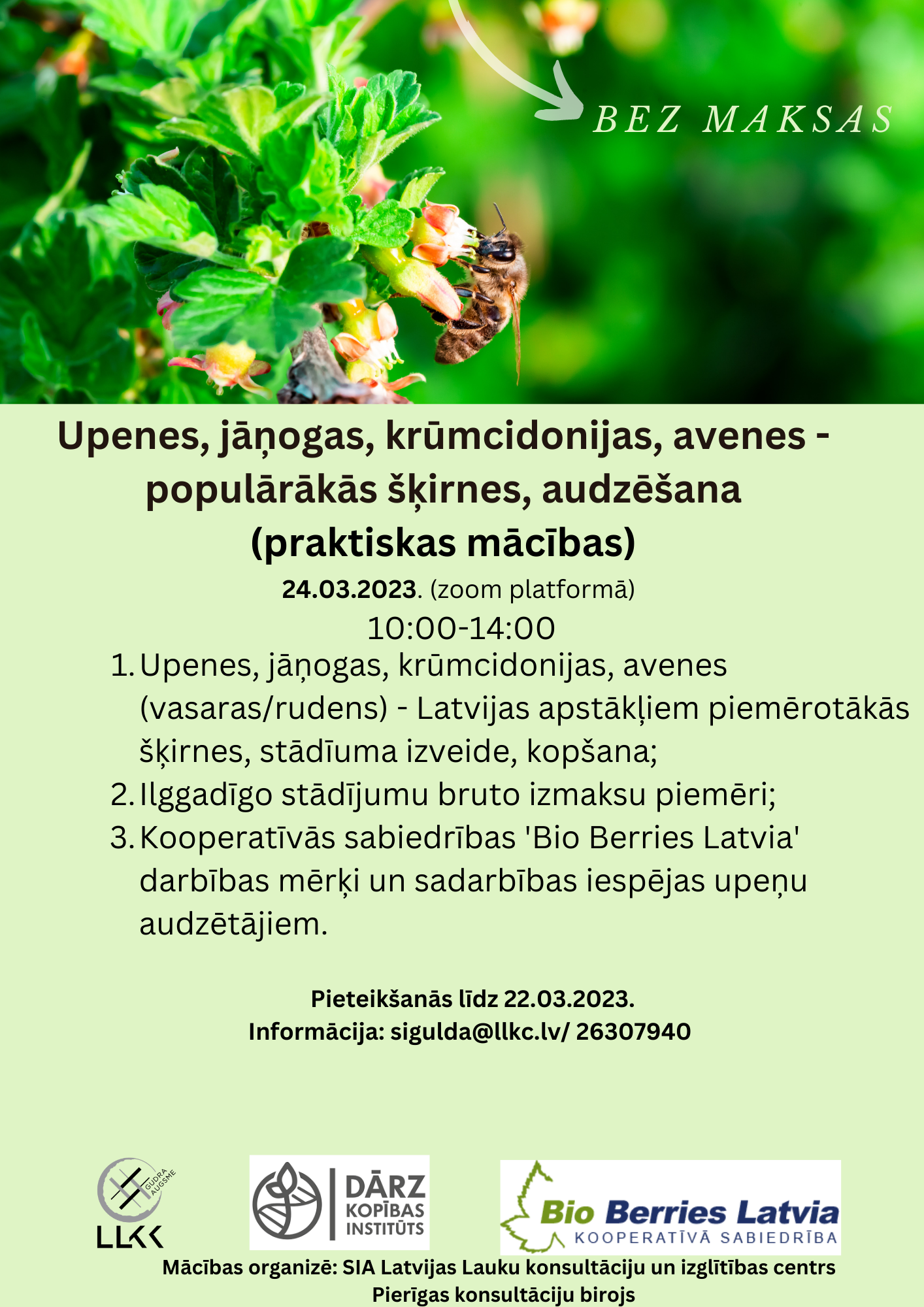 24.03.2023. kā esošie tā potenciālie, ilggadīgo stādījumu audzētāji ir aicināti pievienoties praktiskam semināram-mācībām par upēnu, jāņogu, aveņu un krūmcidoniju audzēšanu. Semināra ietvaros - populārākās šķirnes, to audzēšana, stādījuma izveide un kaitēkļu apkarošana. Papildus iespējas upeņu ogu realizācijai Latvijā.